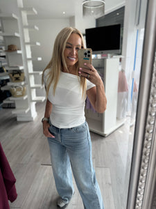 This ruched one-shoulder short sleeve top combines contemporary style with flattering design. The ruched detailing enhances the silhouette, while the asymmetric neckline adds a modern edge. Crafted for comfort and versatility, it pairs effortlessly with both casual and dressier outfits, making it a sophisticated addition to any wardrobe.